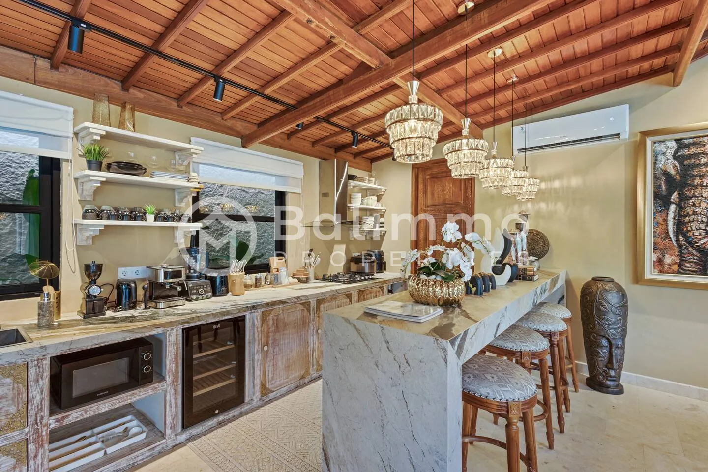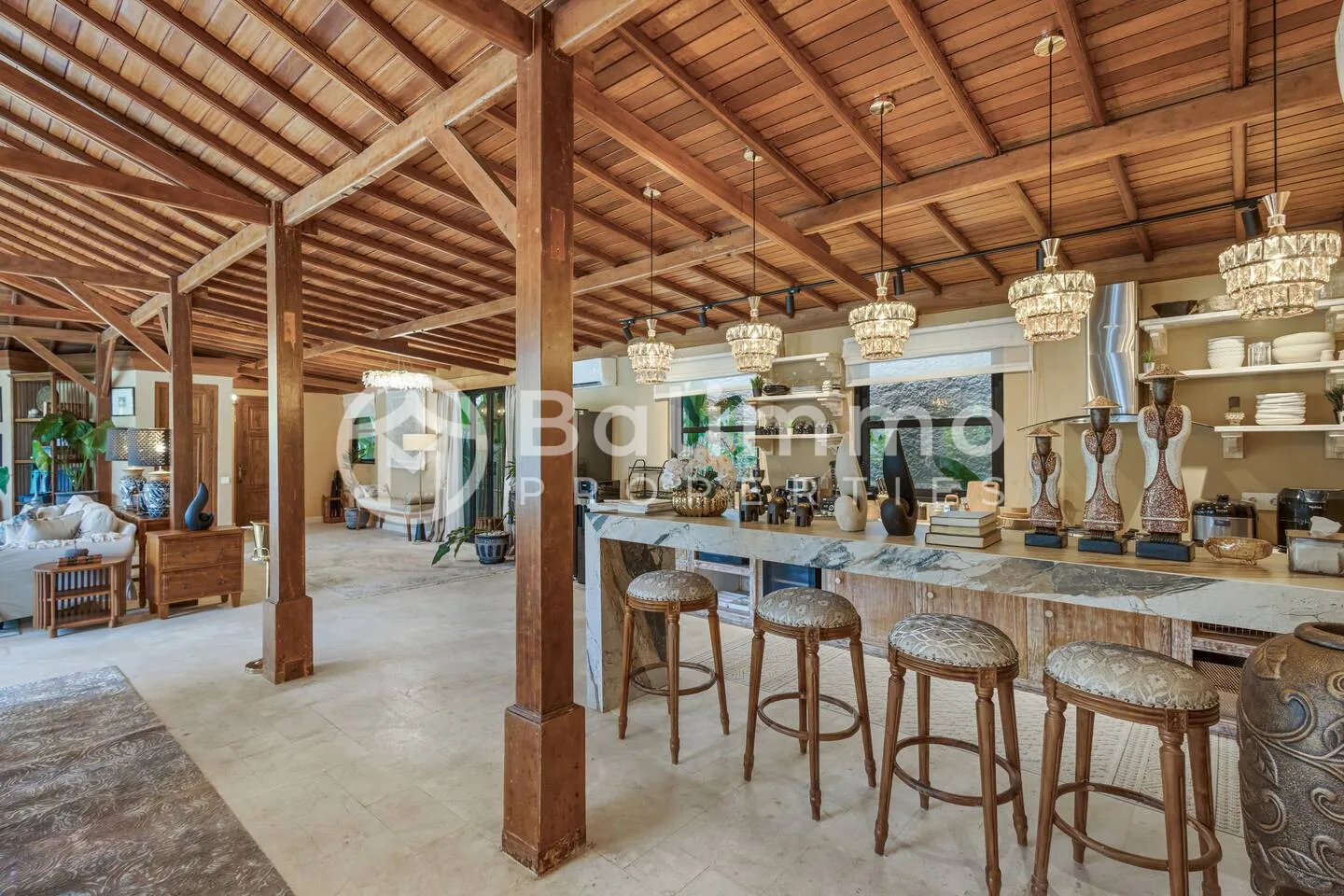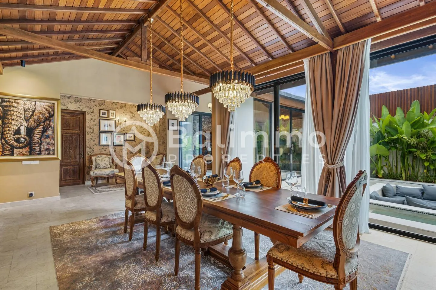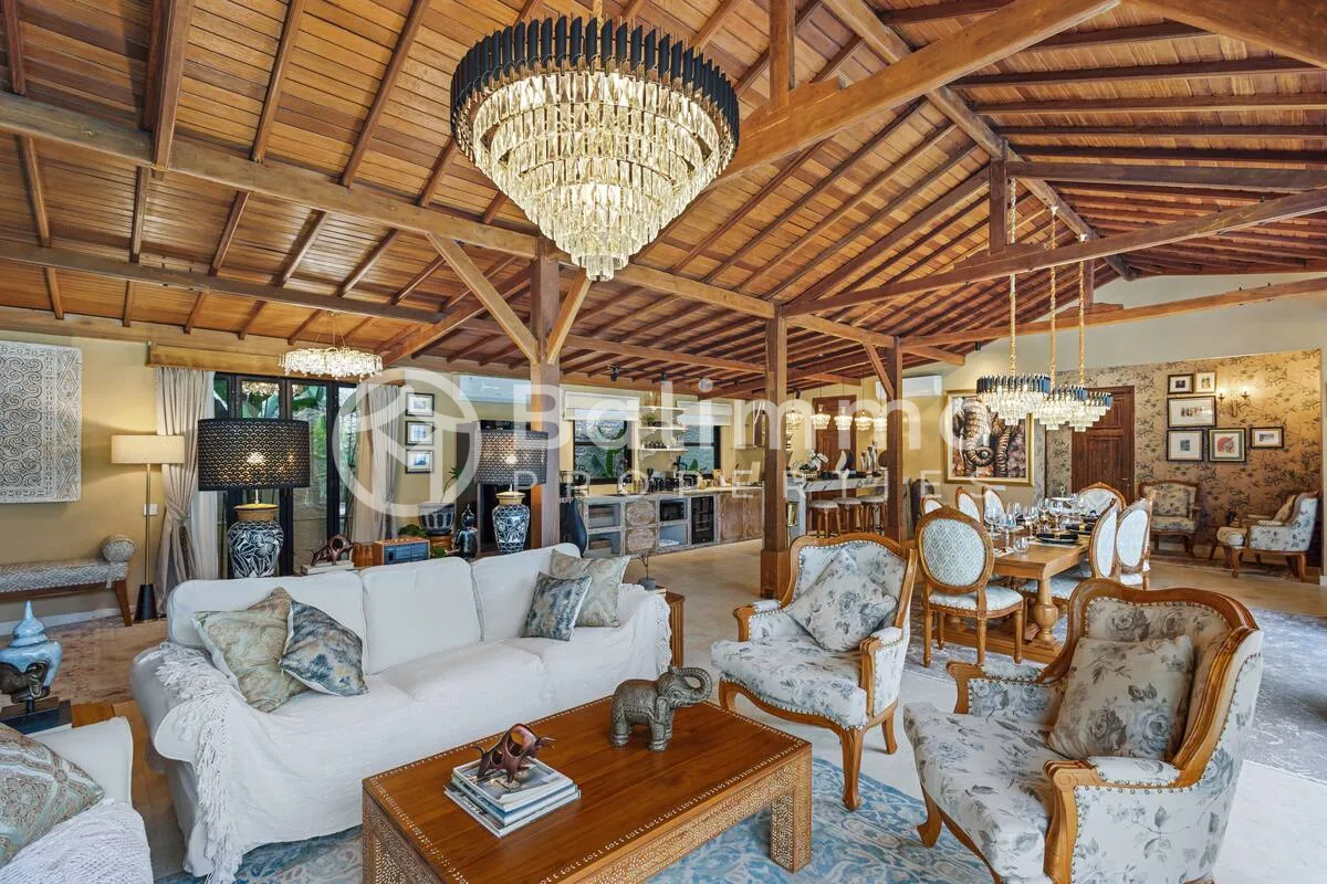 Jimbaran Classic Villa Located in Jimbaran, this villa is 5–10 minutes from Jimbaran Beach and its beachfront seafood restaurants, 15 minutes from Rock Bar at AYANA and GWK Cultural Park, and 20–25 minutes from Balangan, Dreamland, and Uluwatu beaches. Built on 420 m2 of land, the property features a private swimming pool, barbecue area, and private parking. The design combines classic European style with Balinese elements. The 330 m2 interior includes four bedrooms (including a kids’ room), a spacious living room, walk-in wardrobe, home office, and storage. Interiors include hand-carved panels, chandeliers, patterned wallpapers, and custom textiles. Leasehold 25 years + 15-year extension guaranteed. Newly built with SLF and PBG permits. Yellow zoning. BALIMMO PROPERTIES – Contact us to schedule a visit.