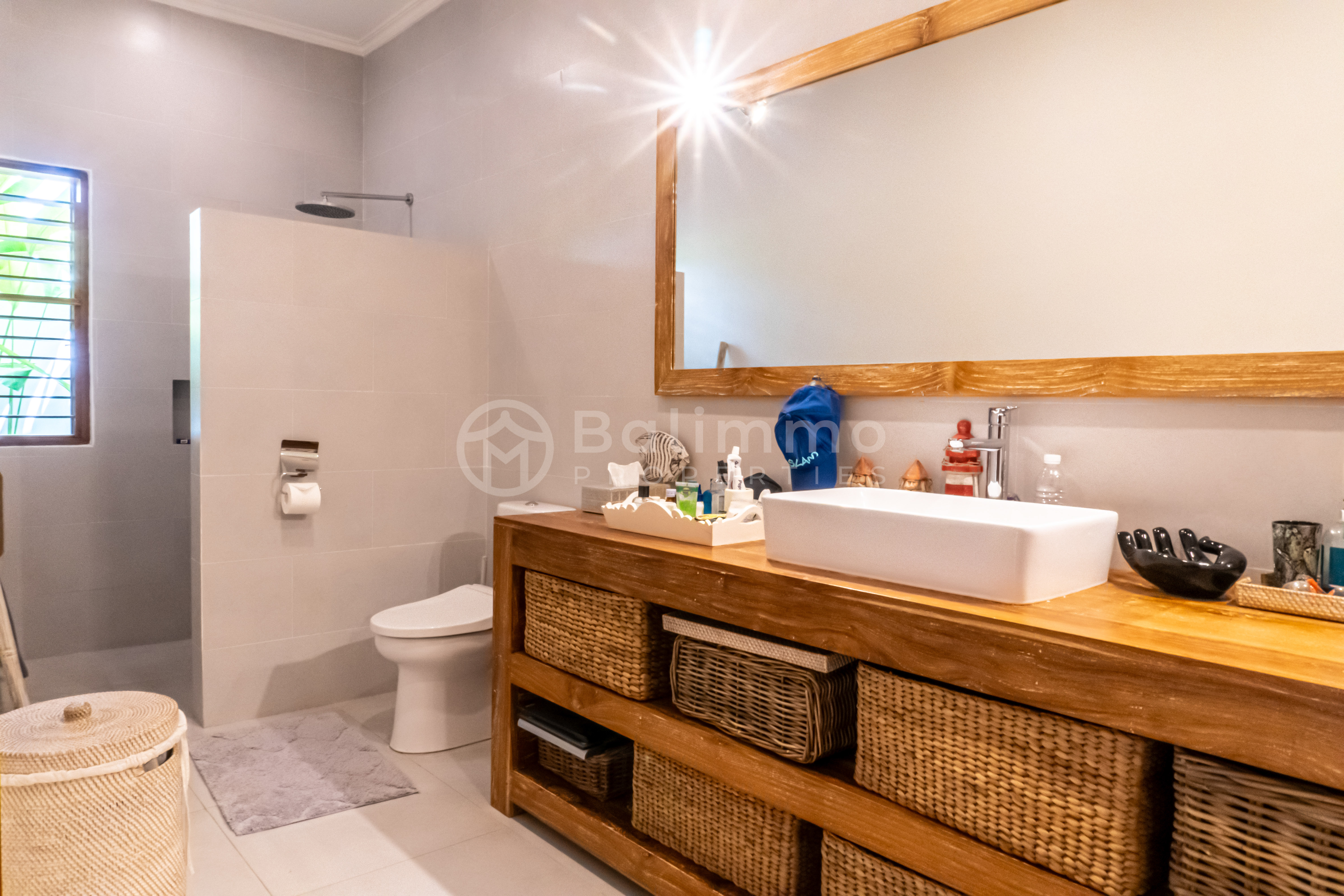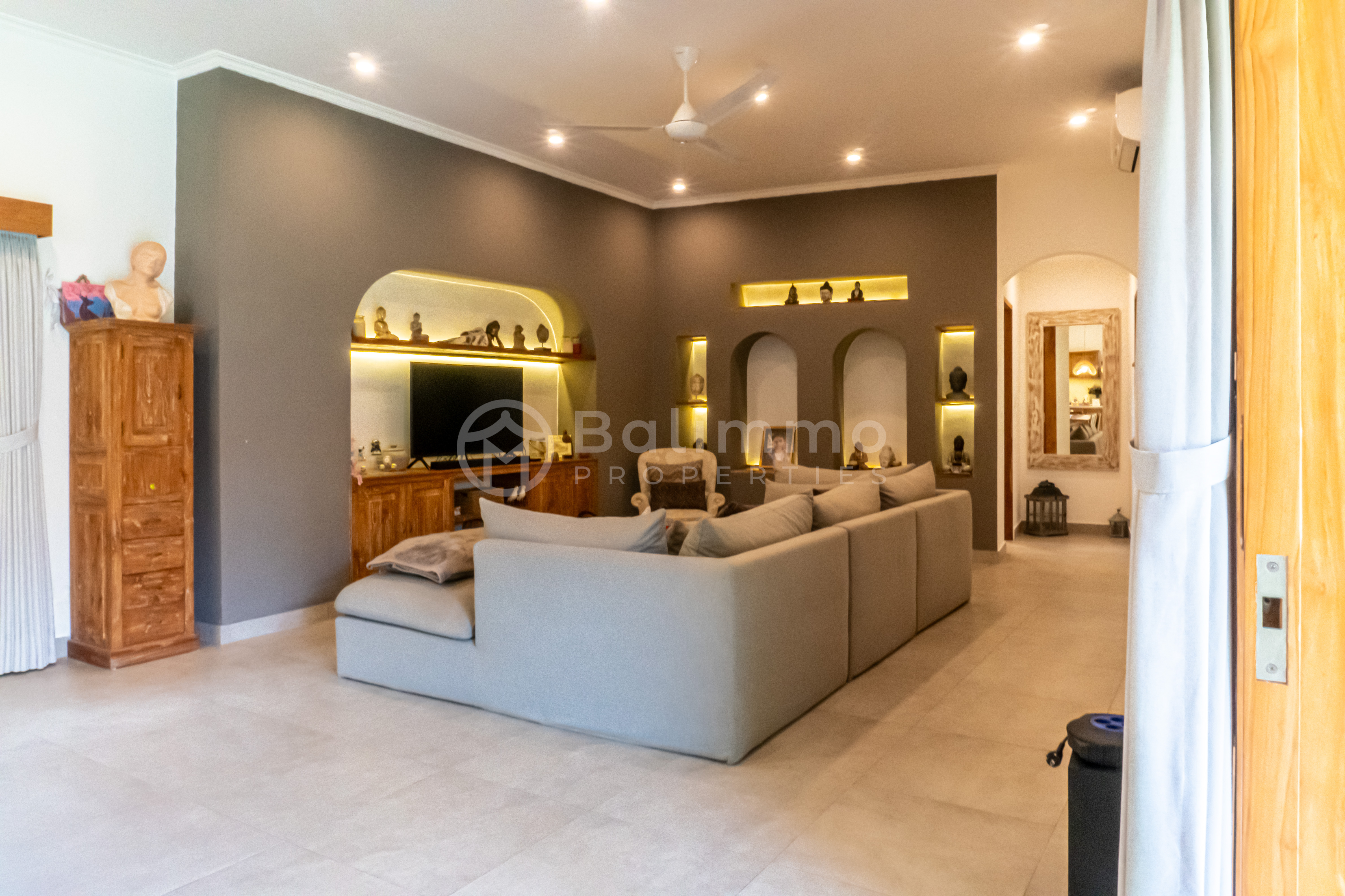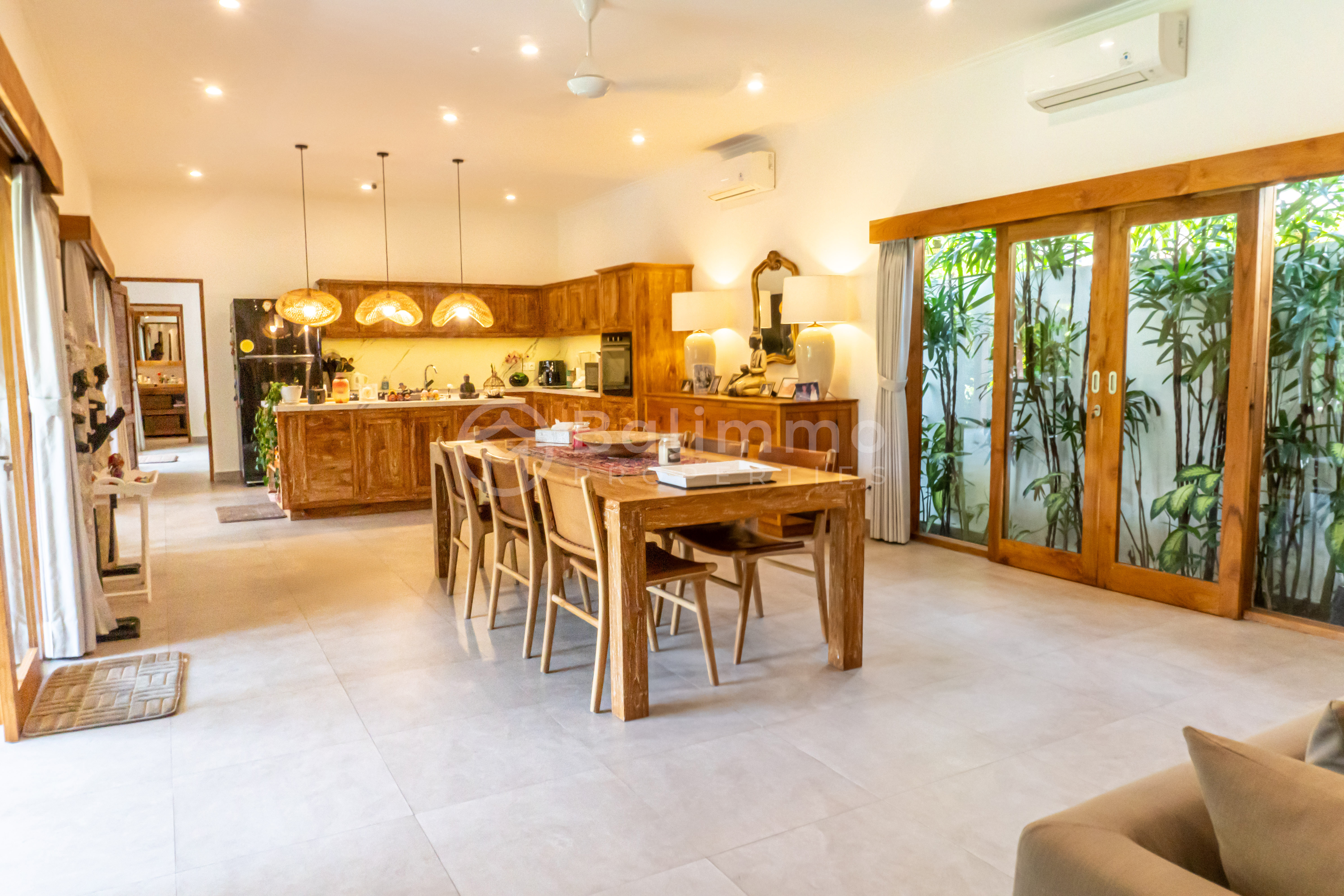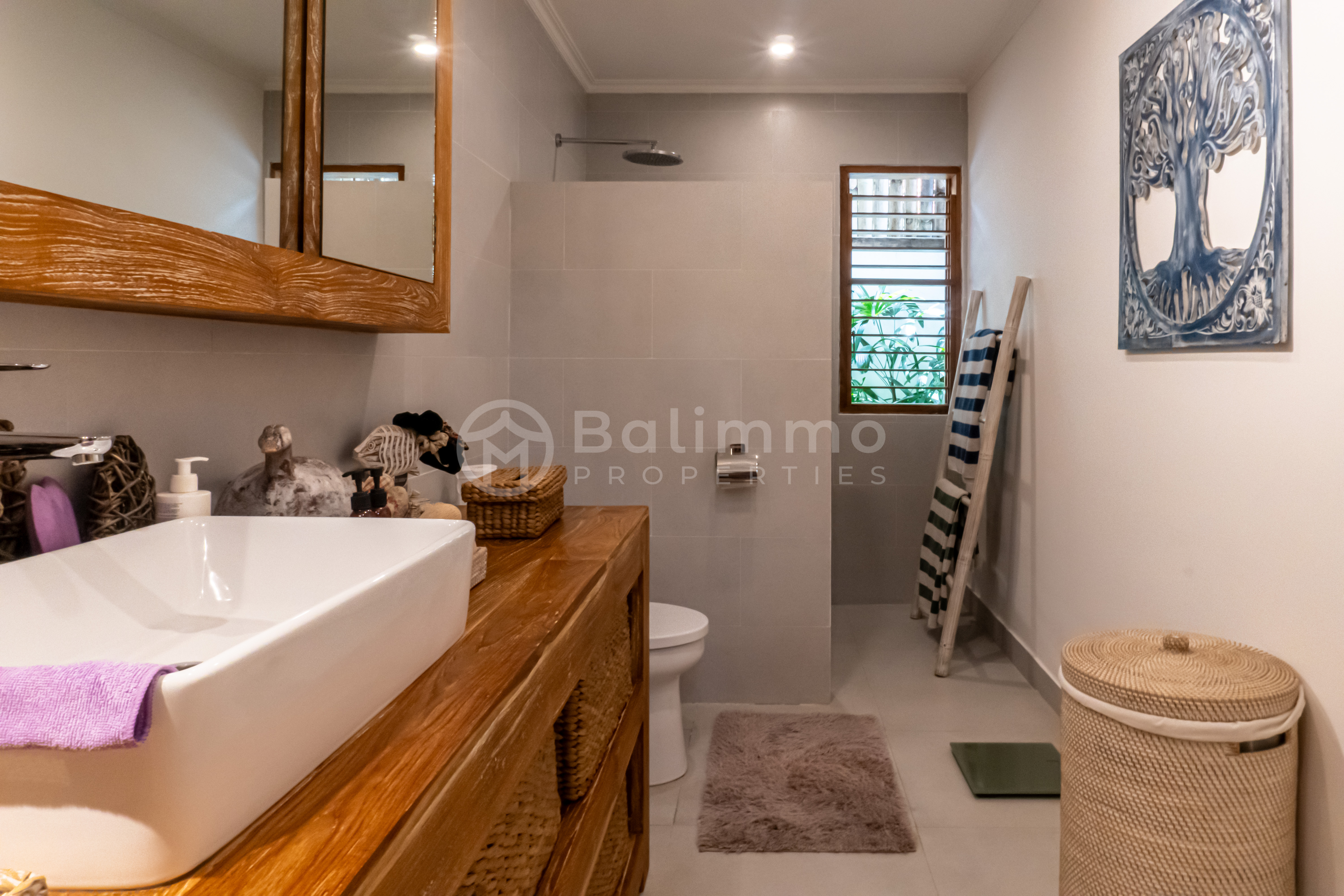 Nestled in Buduk, Mengwi, this Villa Bamboo Whisper offers a peaceful residential setting while remaining within easy reach of Pererenan, Canggu, and Batu Bolong’s cafés, restaurants, and beaches. The property is situated in a yellow-zoned area, ideal for residential living, and enjoys good road access to Denpasar and the airport. Set on a generous 730 m² plot, the villa features a spacious garden and a private swimming pool surrounded by sun loungers and tropical landscaping. The property offers ample parking space and a secure gated entrance. Completed in 2023, the architecture blends modern lines with tropical touches, creating a harmonious indoor-outdoor lifestyle. The building spans 330 m² over a single level, offering four bedrooms, each with its own en-suite bathroom. The open-plan living and dining area flows seamlessly into a fully equipped modern kitchen. Large glass sliding doors fill the space with natural light and connect to the poolside terrace. High-quality finishes and furnishings ensure comfort and style, making the property move-in ready. Key details : • Leasehold until 1 December 2048 • Fully furnished • Year built: 2023 • Land zone: Yellow zone (residential) • Permit : Hak Milik • Price : IDR 8.116.250.000 • USD : 507.266 BALIMMO PROPERTIES – Contact us to schedule a visit.